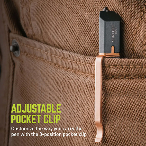 The SCRYBE BOLT 8-in-1 Multi-Tool Pen features a ballpoint pen with bolt-action deployment, rulers, bubble level, 2 micro screwdrivers housed within a removable Tungsten steel tip that serves as a glass breaker, scribe, and box opener. With its unique triangular design and 3-position adjustable clip, the SCRYBE BOLT delivers a customizable writing experience with a variety of easily accessible tools.